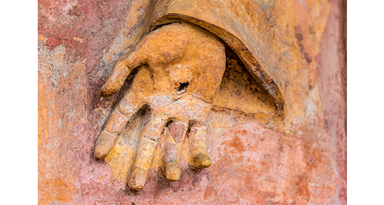 Thomas of Celano describes, “His hands and feet seemed to be pierced by nails, the heads of the nails appearing on the inside of his hands and the upper side of his feet, and their points protruding on the other side. On the palms of his hands these marks were round, but on the outer side they were longer, and there were little pieces of flesh protruding from the surface which looked like the ends of nails, bent and hammered back.”